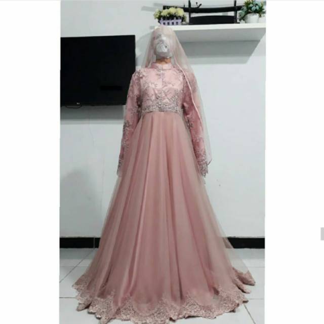 Gamis syari tule brokat amania dusty pink by hawwaaiwa. Set akad alila gaun pengantin syari brukat dress nikah putih pink ungu.